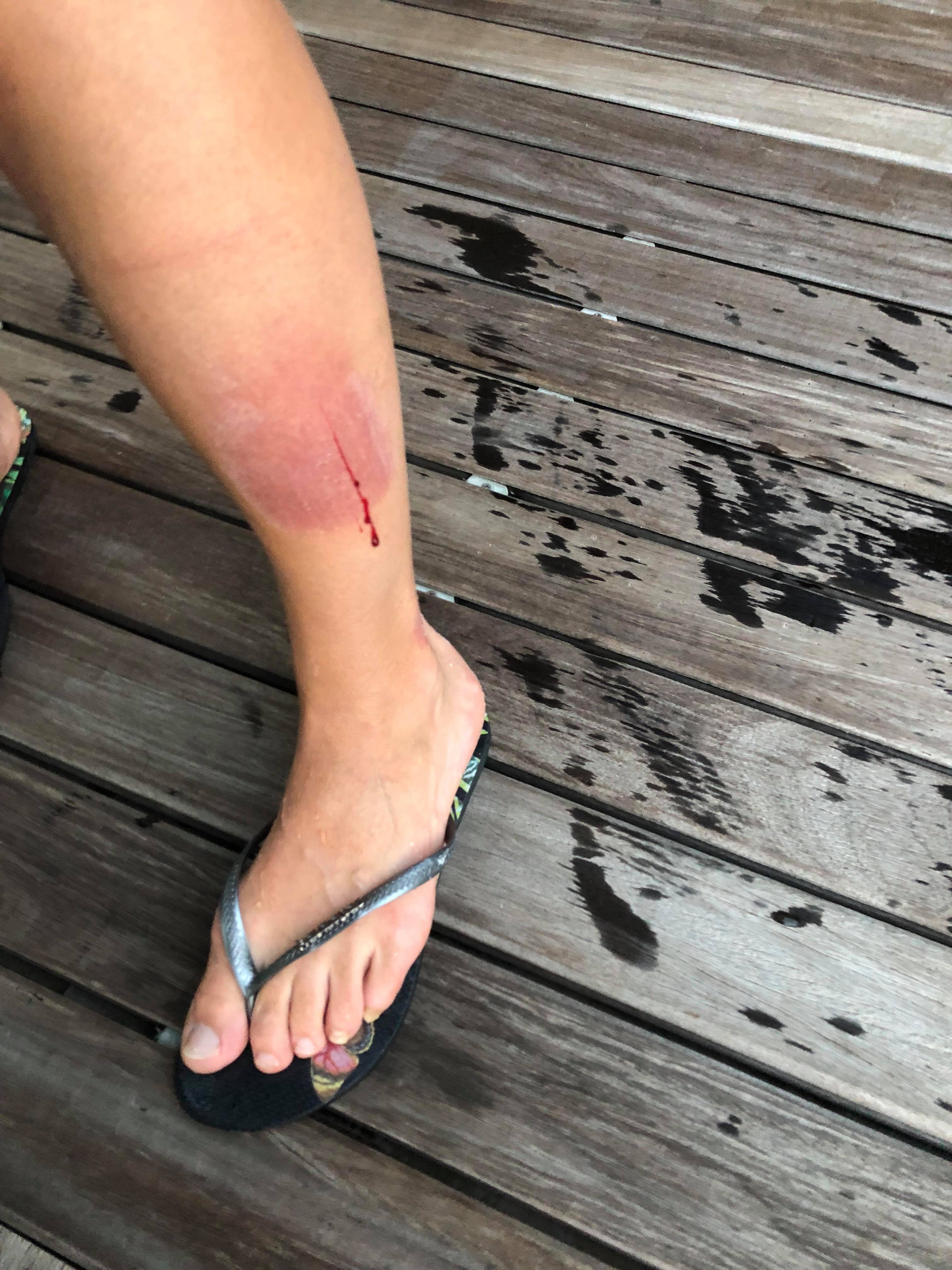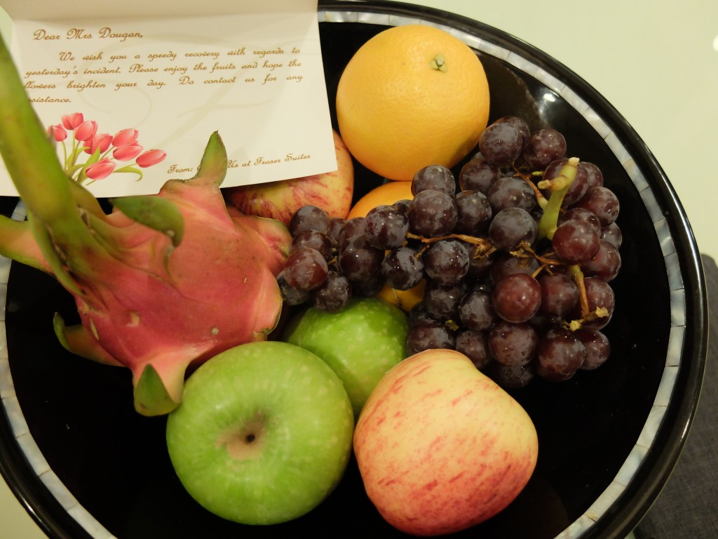One afternoon as we were leaving the pool, all of a sudden my foot went through those plastic grilles that are around the pool. My foot and leg went down into the hole and I banged and scraped the leg, at first I thought I had really hurt myself as it was quite painful. Luckily I escaped with a scrape, bruise and a bit of swelling. And I got flowers and a bowl of fruit from the hotel…