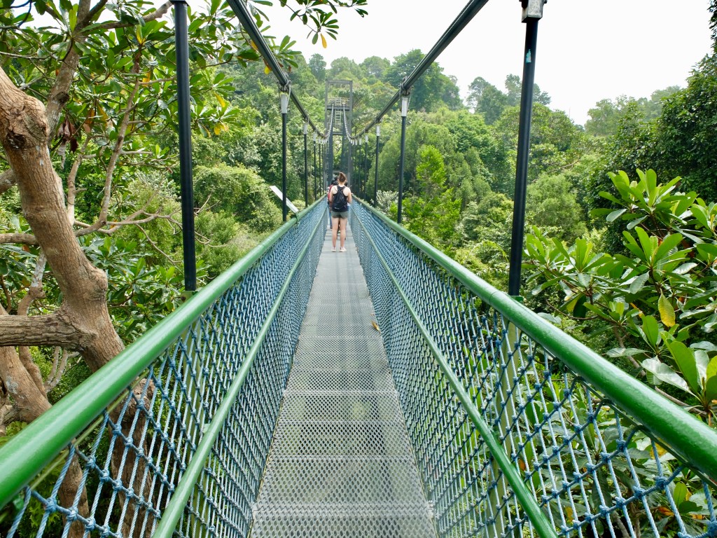 I deliberated a bit and checked the different routes you could do and decided that the shorter walk to the famous Tree Top Walk would probably suit newbies like us the best. That means starting from the entrance at Windsor Park on Venus Drive and following the signs. A 20 minute Grab (Singapore equivalent to Über) ride got us there and after dousing ourselves in mosquito repellant and putting repellant patches on our clothes we were set to go. The trails start straight away, it’s incredibly well organised and on a lot of the way you are walking on wooden walkways through the forest. We spotted some turtles and a big fish in a little creek and as the trails led us deeper into the reserve the sounds of crickets and birds were sometimes almost deafening. I don’t know what insect it is but there is something that can make a very high pitched noise that almost sounds like a car alarm!